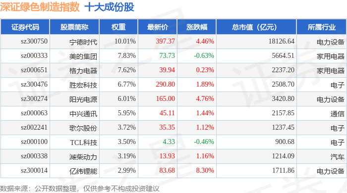 深证绿色制造(970069)指数十大成份股详情如下: