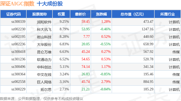 深证AIGC(970075)指数十大成份股详情如下: