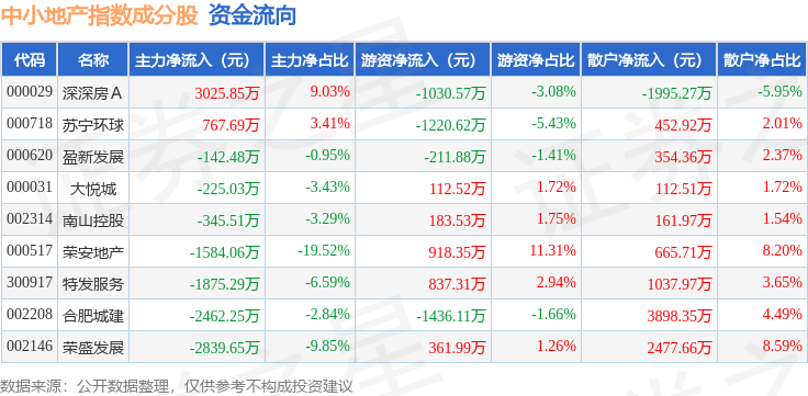 资金流向方面,中小地产(971002)指数成份股当日主力资金净流出合计5680.7万元,游资资金净流出合计1485.48万元,散户资金净流入合计7166.18万元。成份股资金流向详情见下表: