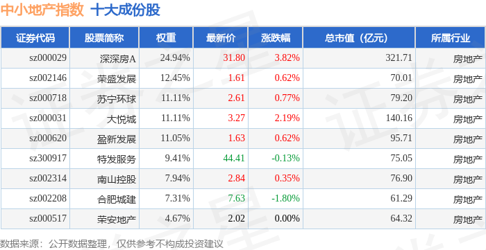证券之星消息,9月29日,中小地产(971002)指数报收于1486.5点,涨1.3%,成交24.01亿元,换手率2.82%。当日该指数成份股中,上涨的有6家,深深房A以3.82%的涨幅领涨,下跌的有2家,合肥城建以1.8%的跌幅领跌。