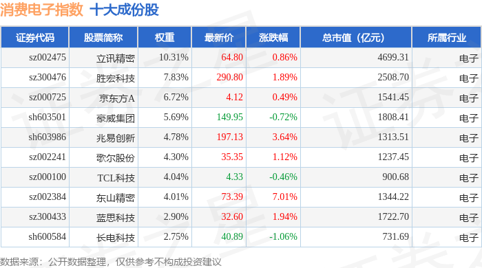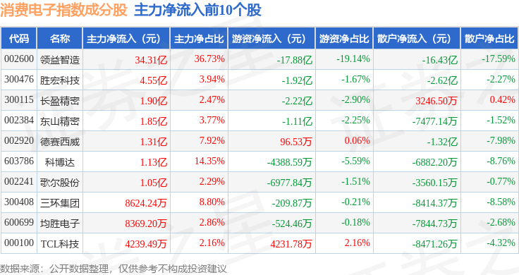 资金流向方面,消费电子(980030)指数成份股当日主力资金净流入合计2.68亿元,游资资金净流出合计10.94亿元,散户资金净流入合计8.25亿元。成份股资金流向详情见下表: