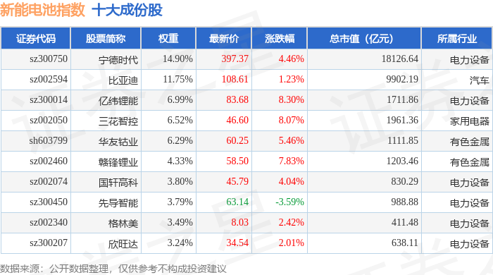 资金流向方面,新能电池(980032)指数成份股当日主力资金净流入合计29.83亿元,游资资金净流出合计13.22亿元,散户资金净流出合计16.61亿元。成份股资金流向详情见下表: