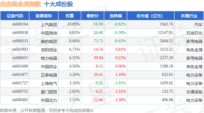 自由现金流(980092)指数十大成份股详情如下: