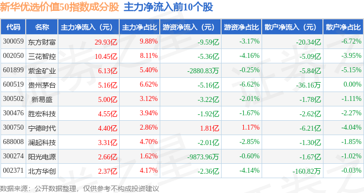 资金流向方面,新华优选价值50(989004)指数成份股当日主力资金净流入合计45.67亿元,游资资金净流出合计10.67亿元,散户资金净流出合计35.0亿元。成份股资金流向详情见下表: