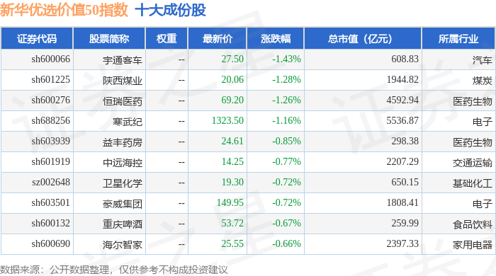 新华优选价值50(989004)指数十大成份股详情如下: