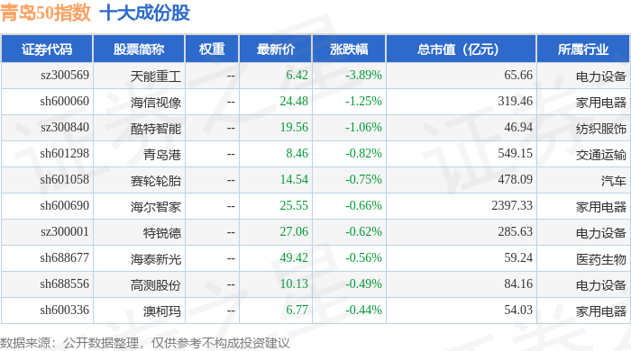 青岛50(989011)指数十大成份股详情如下:
