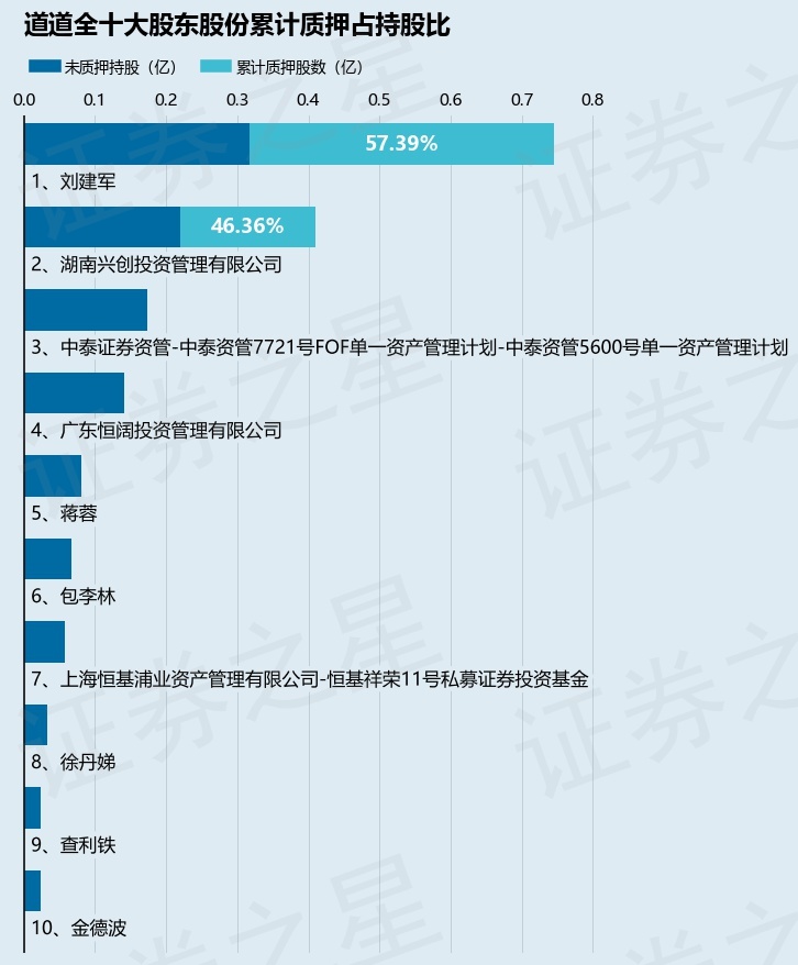 截止本公告日,股东刘建军已累计质押股份4281.0万股,占其持股总数的57.39%,股东湖南兴创投资管理有限公司已累计质押股份1900.0万股,占其持股总数的46.36%。本次质押后道道全十大股东的累计质押股份占持股比例(占持股比例的计算以公司最新一期财务报表公布的十大股东的持股总数为基准)见下图: