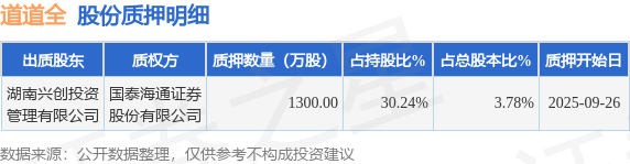 证券之星消息,道道全(002852)9月29日公开信息显示,股东湖南兴创投资管理有限公司向国泰海通证券股份有限公司合计质押1300.0万股,占总股本3.78%。质押详情见下表: