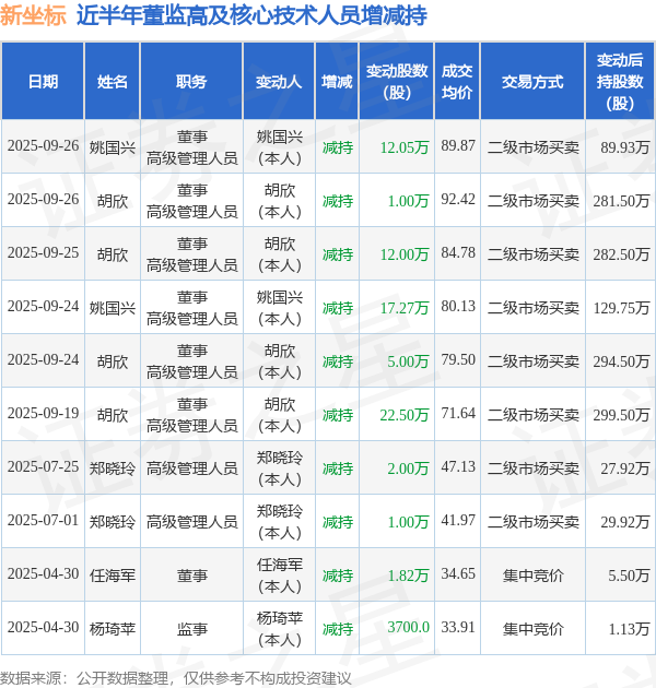 新坐标近半年内的董监高及核心技术人员增减持详情如下:
