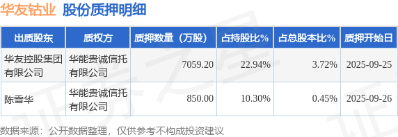 证券之星消息,华友钴业(603799)9月30日公开信息显示,股东华友控股集团有限公司、陈雪华向华能贵诚信托有限公司合计质押7909.2万股,占总股本4.17%。质押详情见下表: