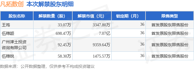 证券之星消息,根据市场公开信息整理,凡拓数创(301313)于9月30日将有882.29万股限售股份解禁,为公司首发原股东限售股份,占公司总股本8.53%。(本次数据根据历史公告整理得出,实际情况以上市公司最新公告为准)本次解禁后,公司还有2796.56万股限售股份,占总股本27.03%。具体如下图所示: