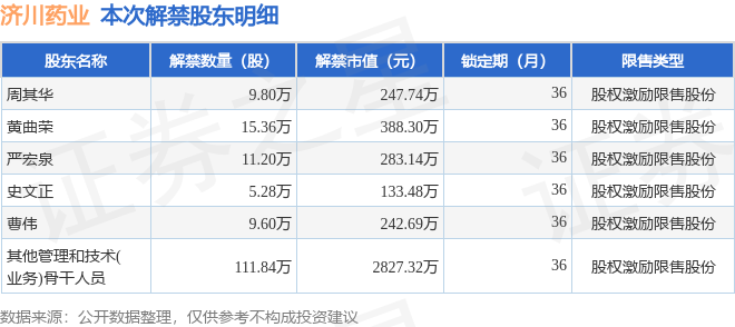 证券之星消息,根据市场公开信息整理,济川药业(600566)于9月30日将有163.08万股限售股份解禁,为公司股权激励限售股份,占公司总股本0.18%。(本次数据根据历史公告整理得出,实际情况以上市公司最新公告为准)本次解禁后,公司还有328.17万股限售股份,占总股本0.36%。具体如下图所示: