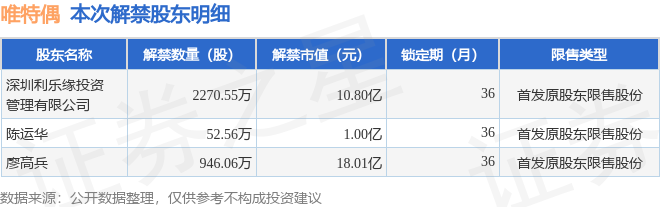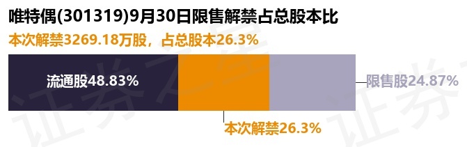 证券之星消息,根据市场公开信息整理,唯特偶(301319)于9月30日将有3269.18万股限售股份解禁,为公司首发原股东限售股份,占公司总股本26.3%。(本次数据根据历史公告整理得出,实际情况以上市公司最新公告为准)本次解禁后,公司还有3091.14万股限售股份,占总股本24.87%。具体如下图所示: