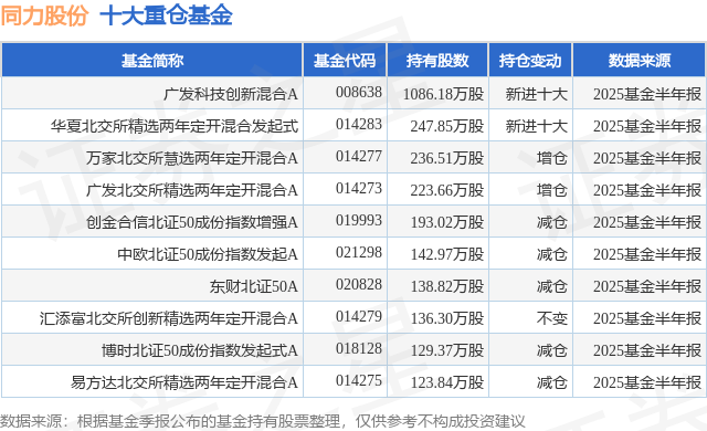 根据2025基金半年报公募基金重仓股数据,重仓该股的公募基金共39家,其中持有数量最多的公募基金为广发基金的广发科技创新混合A。广发科技创新混合A目前规模为26.57亿元,最新净值2.4557(9月29日),较上一交易日上涨3.25%,近一年上涨86.43%。该公募基金现任基金经理为吴远怡。吴远怡在任的基金产品包括:广发创新升级混合,管理时间为2020年9月30日至今,期间收益率为-14.49%;广发北交所精选两年定开混合A,管理时间为2021年11月23日至今,期间收益率为76.86%;广发价值核心混合A,管理时间为2022年11月1日至今,期间收益率为89.31%。