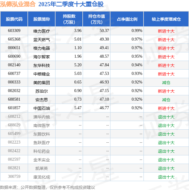 泓德泓业混合的前十大重仓股如下: