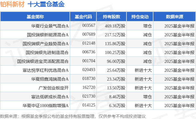 根据2025基金半年报公募基金重仓股数据,重仓该股的公募基金共15家,其中持有数量最多的公募基金为华夏基金的华夏行业景气混合A。华夏行业景气混合A目前规模为72.61亿元,最新净值4.8557(9月29日),较上一交易日上涨1.41%,近一年上涨88.63%。该公募基金现任基金经理为钟帅。钟帅在任的基金产品包括:华夏远见成长一年持有混合A,管理时间为2022年9月20日至今,期间收益率为34.62%;华夏招鑫鸿瑞混合A,管理时间为2024年1月16日至今,期间收益率为104.72%;华夏卓越成长混合A,管理时间为2025年8月12日至今,期间收益率为13.16%。