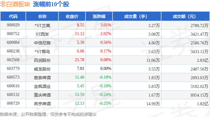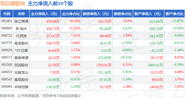 从资金流向上来看,当日非白酒板块主力资金净流出9850.41万元,游资资金净流入3287.58万元,散户资金净流入6562.83万元。非白酒板块个股资金流向见下表: