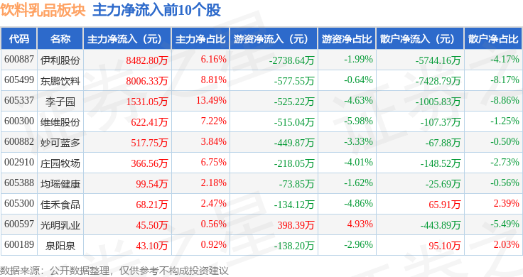 从资金流向上来看,当日饮料乳品板块主力资金净流入6113.99万元,游资资金净流出874.41万元,散户资金净流出5239.58万元。饮料乳品板块个股资金流向见下表: