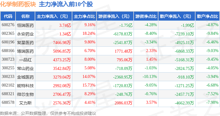 从资金流向上来看,当日化学制药板块主力资金净流入2.56亿元,游资资金净流入6403.82万元,散户资金净流出3.2亿元。化学制药板块个股资金流向见下表: