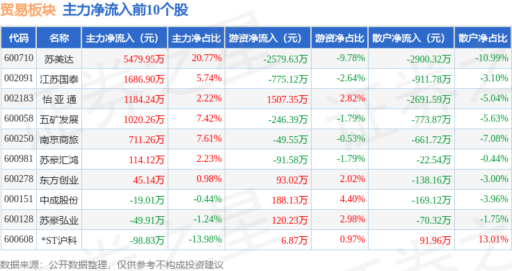 从资金流向上来看,当日贸易板块主力资金净流入9313.3万元,游资资金净流出3692.53万元,散户资金净流出5620.78万元。贸易板块个股资金流向见下表: