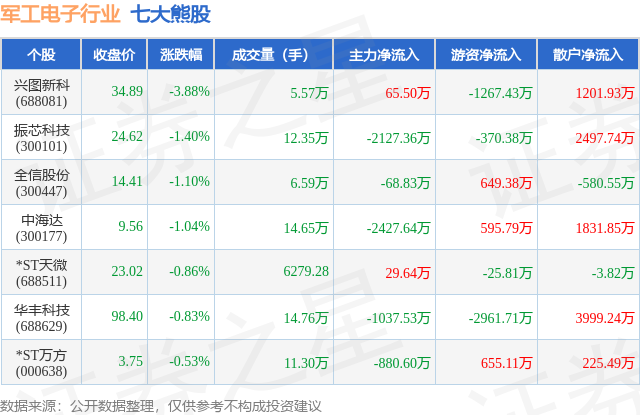 个股表现方面,军工电子行业当日领跌股为兴图新科(688081),该股当日报收34.89,下跌3.88%,成交量5.57万,主力资金净流入65.5万元。振芯科技(300101)以下跌1.4%紧随其后,该股当日成交量12.35万,主力资金净流出2127.36万元。除此之外,全信股份(300447)、中海达(300177)、*ST天微(688511)均进入当日熊股之列。具体个股列表见下表: