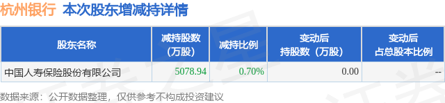 证券之星消息,9月30日杭州银行发布公告《杭州银行:杭州银行5%以下股东减持股份结果公告》,其股东中国人寿保险股份有限公司于2025年7月21日至2025年9月30日间合计减持5078.94万股,占公司目前总股本的0.7006%,变动期间该股股价下跌11.48%,截止9月30日收盘报15.27元。