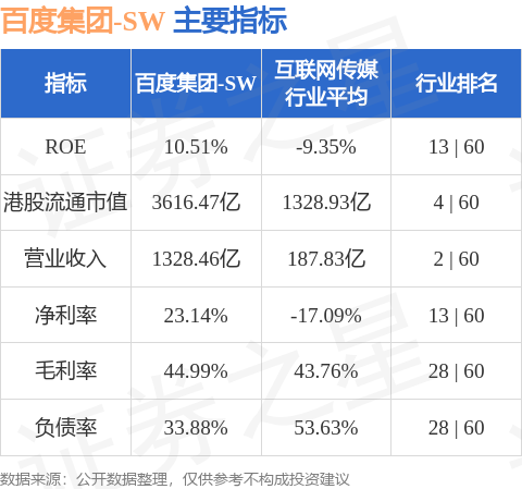 百度集团-SW港股市值3616.47亿港元,在互联网传媒行业中排名第4。主要指标见下表: