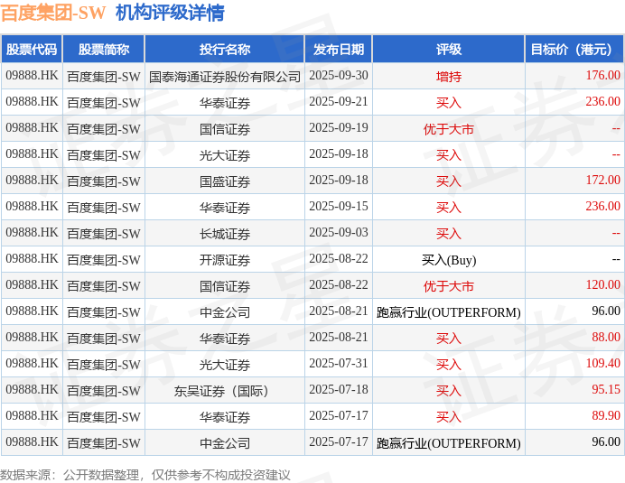 截至2025年9月30日收盘,百度集团-SW(09888.HK)报收于133.2港元,上涨1.29%,成交量2194.9万股,成交额28.8亿港元。投行对该股的评级以买入为主,近90天内共有9家投行给出买入评级,近90天的目标均价为137.68港元。国泰海通证券股份有限公司最新一份研报给予百度集团-SW增持评级,目标价176港元。