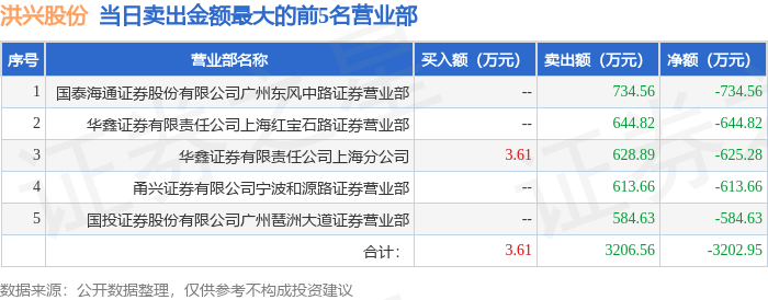 证券之星消息,沪深交易所2025年9月30日公布的交易公开信息显示,洪兴股份(001209)因日跌幅偏离值达到7%的前5只证券登上龙虎榜。此次是近5个交易日内第1次上榜。
