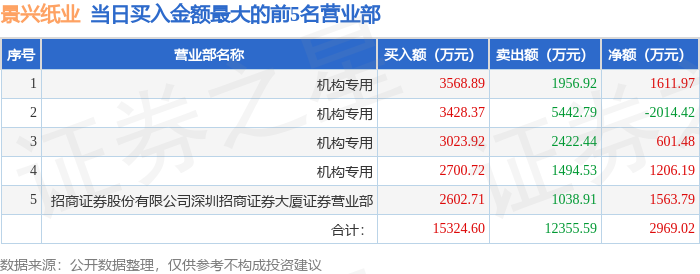 证券之星消息,沪深交易所2025年9月30日公布的交易公开信息显示,景兴纸业(002067)因日换手率达到20%的前5只证券登上龙虎榜。此次是近5个交易日内第1次上榜。
