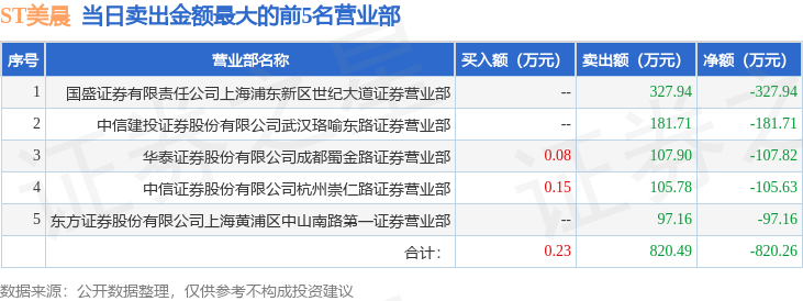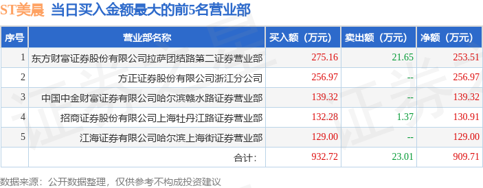 证券之星消息,沪深交易所2025年9月30日公布的交易公开信息显示,ST美晨(300237)因日跌幅达到15%的前5只证券登上龙虎榜。此次是近5个交易日内第1次上榜。