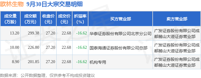 证券之星消息,9月30日欧林生物发生大宗交易,交易数据如下: