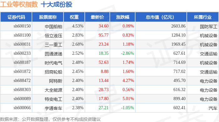 证券之星消息,9月30日,工业等权(000072)指数报收于2965.06点,涨1.4%,成交555.04亿元,换手率0.95%。当日该指数成份股中,上涨的有34家,中航沈飞以10.0%的涨幅领涨,下跌的有13家,圆通速递以2.86%的跌幅领跌。