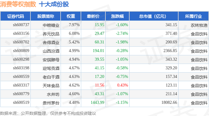 消费等权(000074)指数十大成份股详情如下: