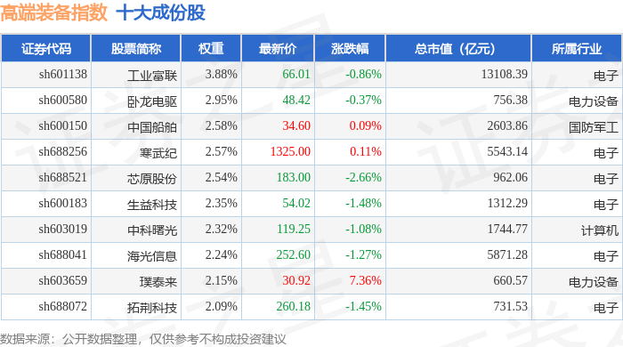证券之星消息,9月30日,高端装备(000097)指数报收于11641.52点,涨1.83%,成交1948.62亿元,换手率1.86%。当日该指数成份股中,上涨的有45家,中航沈飞以10.0%的涨幅领涨,下跌的有14家,闻泰科技以3.49%的跌幅领跌。