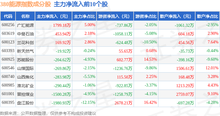 资金流向方面,380能源(000104)指数成份股当日主力资金净流出合计1.42亿元,游资资金净流入合计2934.31万元,散户资金净流入合计1.12亿元。成份股资金流向详情见下表: