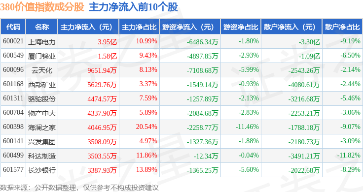资金流向方面,380价值(000118)指数成份股当日主力资金净流出合计2.85亿元,游资资金净流入合计0.44万元,散户资金净流入合计2.85亿元。成份股资金流向详情见下表:
