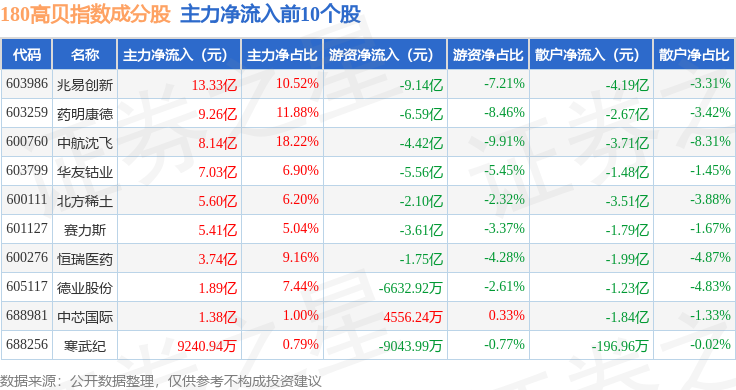 资金流向方面,180高贝(000135)指数成份股当日主力资金净流出合计22.93亿元,游资资金净流入合计10.02亿元,散户资金净流入合计12.91亿元。成份股资金流向详情见下表: