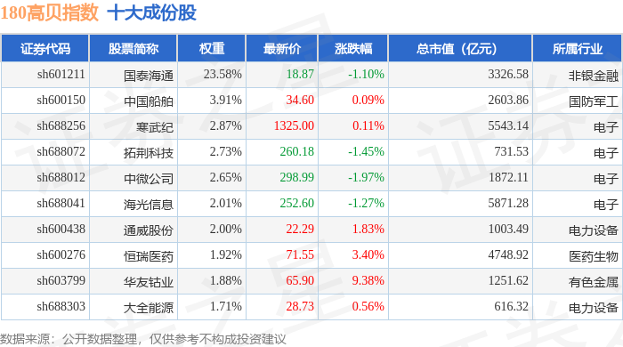 证券之星消息,9月30日,180高贝(000135)指数报收于6223.14点,涨0.83%,成交1826.7亿元,换手率1.25%。当日该指数成份股中,上涨的有36家,中航沈飞以10.0%的涨幅领涨,下跌的有22家,中微公司以1.97%的跌幅领跌。