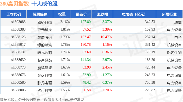 证券之星消息,9月30日,380高贝(000137)指数报收于6235.22点,涨1.88%,成交828.59亿元,换手率3.12%。当日该指数成份股中,上涨的有68家,固德威以12.68%的涨幅领涨,下跌的有32家,旭升集团以3.46%的跌幅领跌。