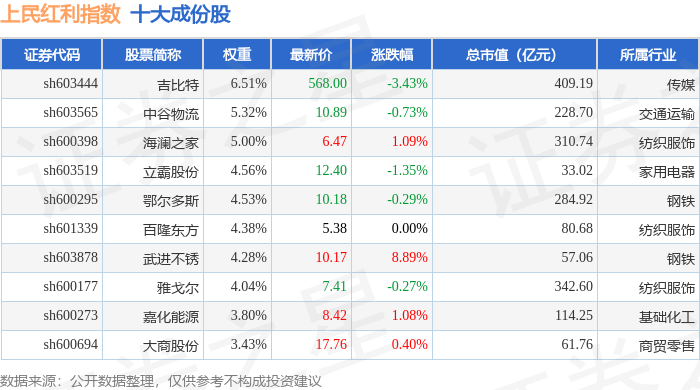 上民红利(000153)指数十大成份股详情如下: