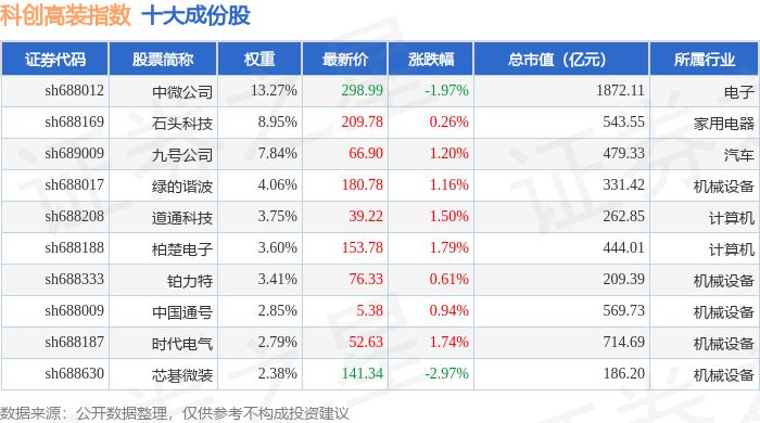 科创高装(000687)指数十大成份股详情如下: