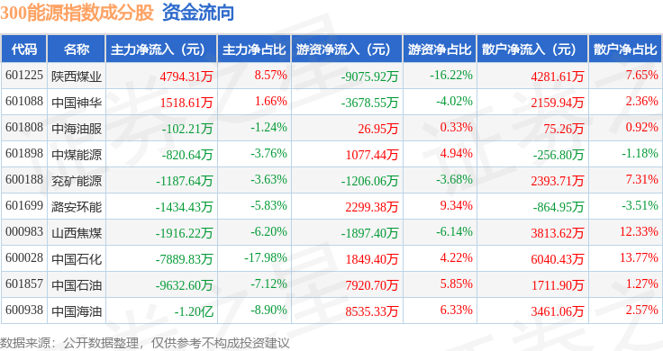 资金流向方面,300能源(000908)指数成份股当日主力资金净流出合计2.87亿元,游资资金净流入合计5851.27万元,散户资金净流入合计2.28亿元。成份股资金流向详情见下表: