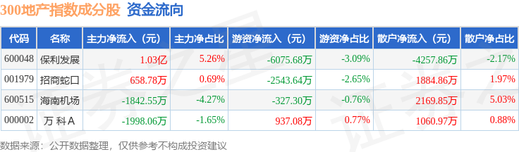 资金流向方面,300地产(000952)指数成份股当日主力资金净流入合计7151.71万元,游资资金净流出合计8009.53万元,散户资金净流入合计857.82万元。成份股资金流向详情见下表: