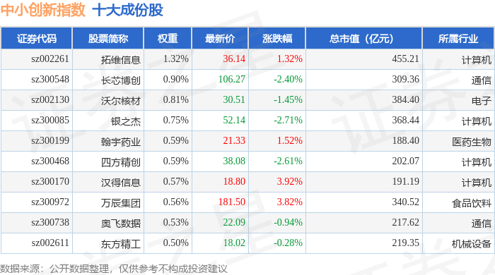 中小创新(399015)指数十大成份股详情如下: