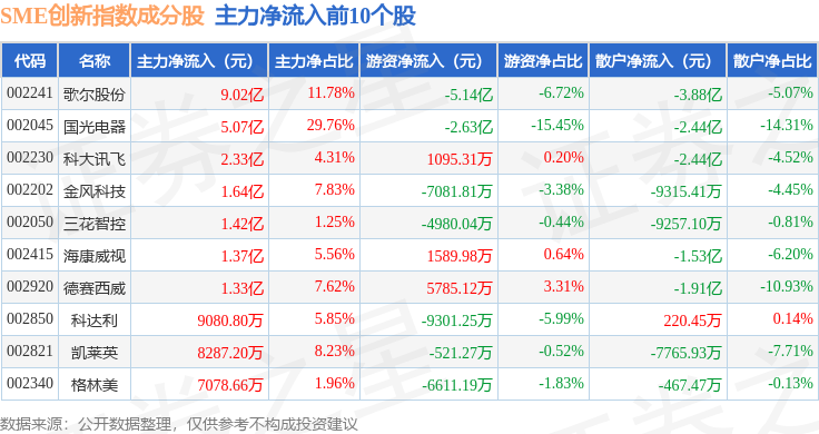 资金流向方面,SME创新(399017)指数成份股当日主力资金净流出合计55.34亿元,游资资金净流入合计12.52亿元,散户资金净流入合计42.83亿元。成份股资金流向详情见下表: