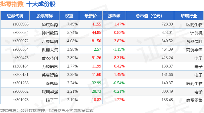 证券之星消息,9月30日,批零指数(399236)报收于1508.86点,涨1.15%,成交248.65亿元,换手率2.81%。当日该指数成份股中,上涨的有50家,星徽股份以20.0%的涨幅领涨,下跌的有42家,有棵树以4.47%的跌幅领跌。