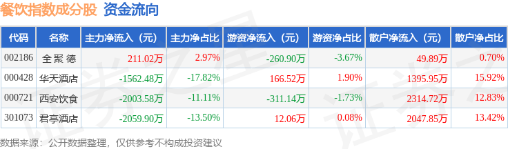 资金流向方面,餐饮指数(399238)成份股当日主力资金净流出合计5414.95万元,游资资金净流出合计393.47万元,散户资金净流入合计5808.41万元。成份股资金流向详情见下表: