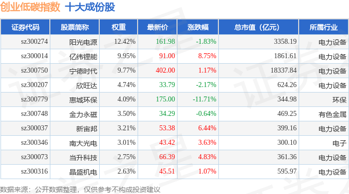 创业低碳(399259)指数十大成份股详情如下: