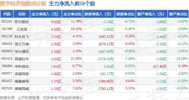 资金流向方面,数字经济(399262)指数成份股当日主力资金净流出合计66.97亿元,游资资金净流入合计27.92亿元,散户资金净流入合计39.05亿元。成份股资金流向详情见下表: